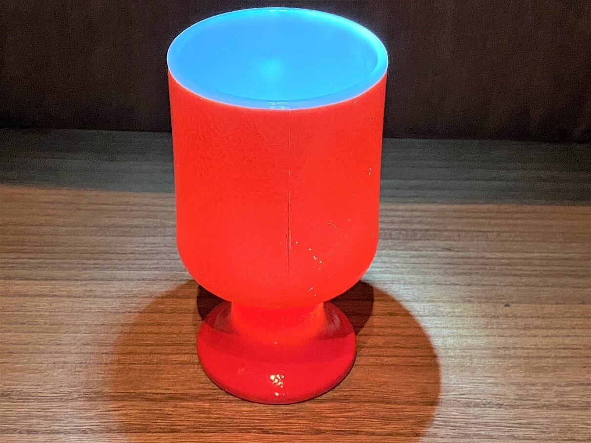 ミルクガラス表面に荒くスプレー塗布した硬質ラバー(赤)にてコーティングされた製品です。普通のミルクガラスに比べてぶつぶつしたラバーの質感が独特です。