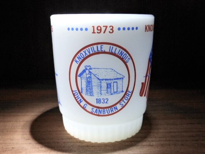 1973年 にアメリカ独立記念として、テネシー州のノックスビルで配られたアドバタイジングマグとなります。1970年代に ミルクガラスと言えば真っ先に名前の挙がるファイヤーキング製のマグカップです。