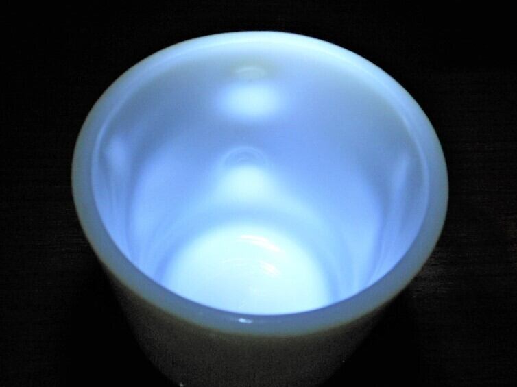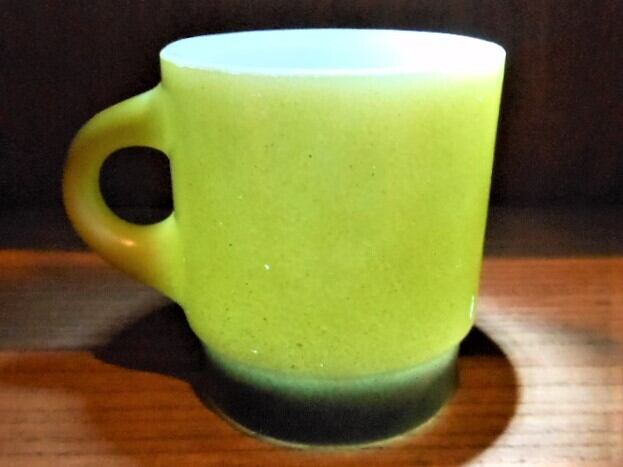 1970年代の製品だと思います。ミルクガラスで有名なファイヤーキング(アンカーホッキング)製のマグカップです。ミルクガラスをベースに黄緑色とモスグリーンの2色で色付けした製品です。いくつか傷は有りますが、使用した事による色剥げは少ないと思います。