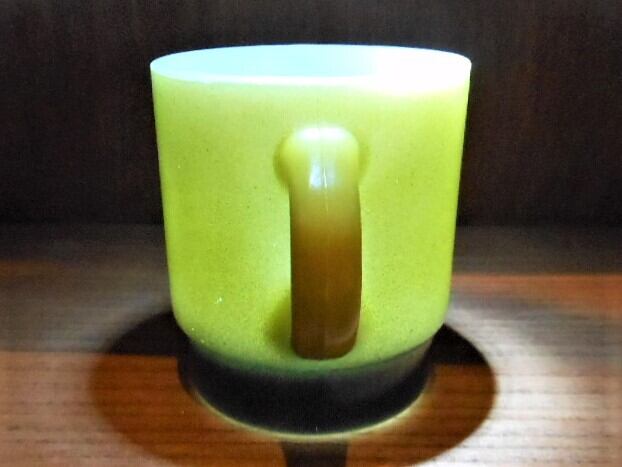 1970年代の製品だと思います。ミルクガラスで有名なファイヤーキング(アンカーホッキング)製のマグカップです。ミルクガラスをベースに黄緑色とモスグリーンの2色で色付けした製品です。いくつか傷は有りますが、使用した事による色剥げは少ないと思います。