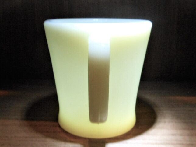 古くは1940年代 - 1970年代まで大きくデザインを変えずにファイヤーキング社により作り続けられたDハンドルマグカップのアイボリーです。ミルクガラスの代表会社と言えるほどのファイヤーキング製品の中でも特にDハンドルは人気の商品となります。