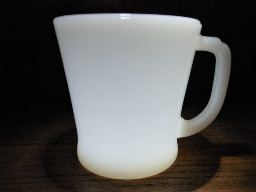 古くは1940年代 - 1970年代まで大きくデザインを変えずにファイヤーキング社により作り続けられたDハンドルマグカップのホワイトです。ミルクガラスの代表会社と言えるほどのファイヤーキング製品の中でも特にDハンドルは人気の商品となります。