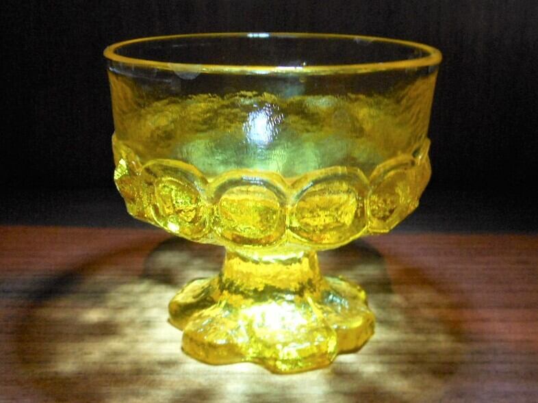 1972 - 78年までフランシスカン社によって生産されたシャーベットグラスです。デザイン名をマデイラ コーンシルクと言います。とても特徴的なデザインで、一目でこの会社の製品と判るほどの代表作の様です。面白い事に、今回出品した5点の全てにおいて、デザインは同じですが、微妙に形が異なります。どうやったらこれだけの違いが作れるのか不思議です。開口径は約9.5㎝となります。