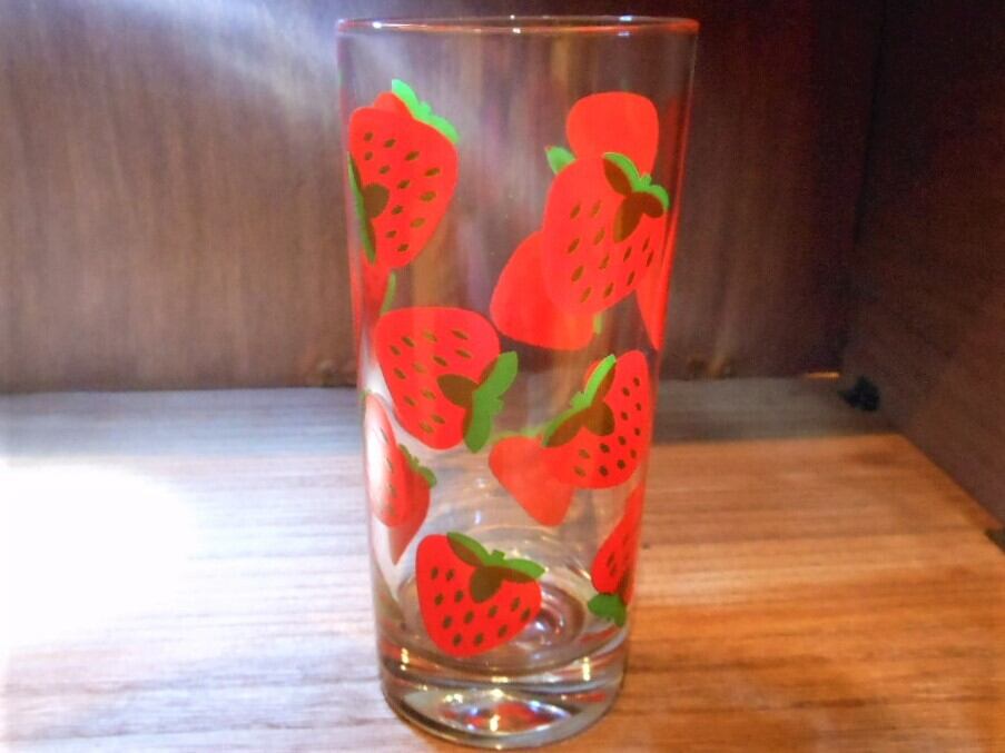 年代不明。 コロニー社製の ストロベリープリントタンブラー。高さ約16㎝ / 開口径 7㎝ の商品となります。食器棚がパッと華やぐ、イチゴデザインのタンブラーになります。