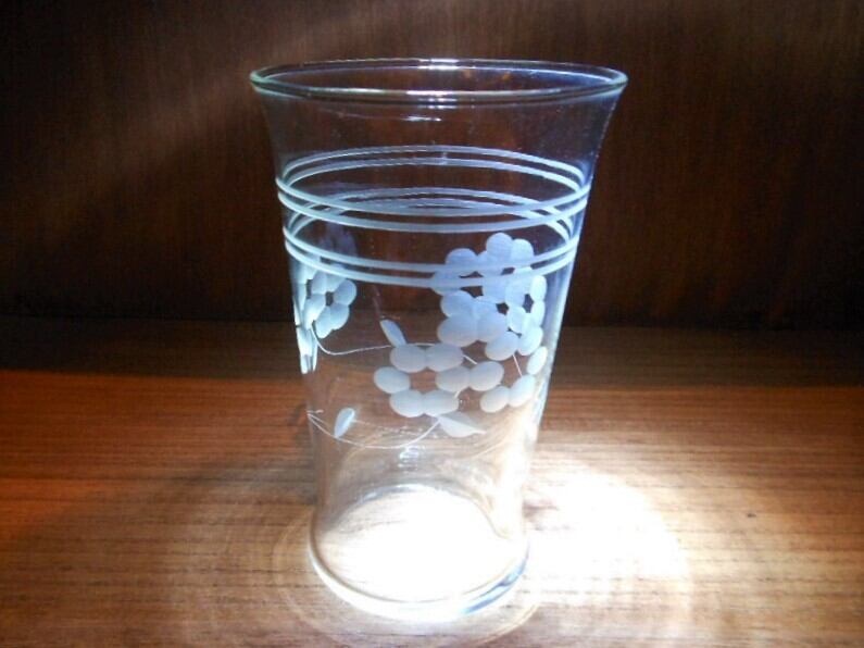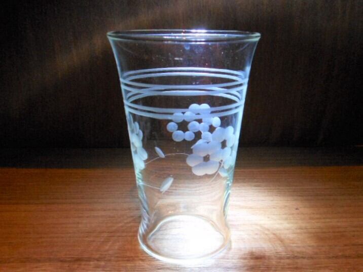 1950年代 スタンダードガラス社製で、この時代では主流の吹きガラスの型押し成型に花柄をエッチングしたタンブラーです。もし現代に同じ製法で作られたガラス食器に、グラインダーエッチング(切子)を施すととんでもなく高価な高級タンブラーになると思います。約70年の時を生きぬいてきた商品をお手元にどうでしょうか。高さ 約12㎝ / 開口径 約7.5㎝