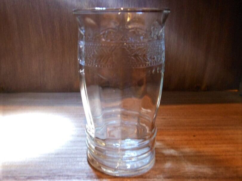 1930 - 33年の短い期間のみ エレガントなガラス食器のメーカーとして有名なマクベスエバンス社によって生産された、吹きガラス型押しタンブラーです。モデルを ”ステップルド ローズバンド クリアー ” と言います。高さ 約12㎝ / 開口径 約6.5㎝ の商品となります。