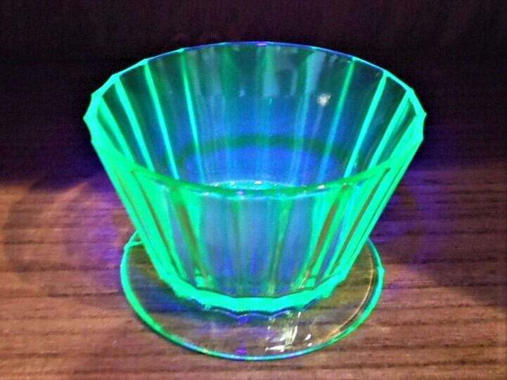 年代、メーカー共に不明。ウランガラス製ですので、1950年以前の製品だとは思います。開口径 約7㎝の商品になります。メーカー不明ですが、作りが綺麗な為、ブラックライト下でとても綺麗に輝きます。ただ、本製品は、底部に成型時に出来たと思われる傷が有ります。