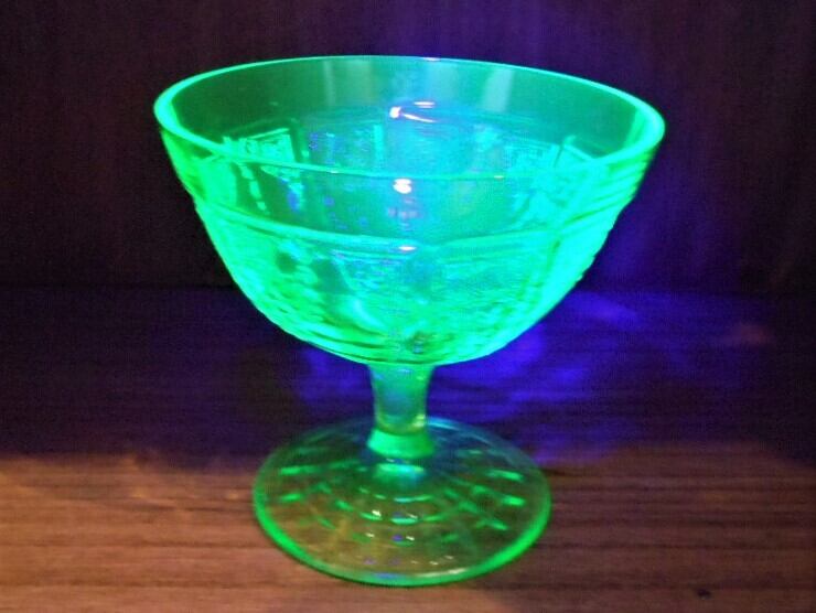 他のウランガラス同様に、ブラックライト下で、とても綺麗に光ります。