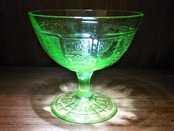 1931 - 35年 アンカーホッキング社によって生産されたシャーベットグラスです。モデル名を ”プリンセス” と言います。お姫様の寝室の天幕に似たデザインからこの様に呼ばれているようです。デザインがエレガントな事から、アンカーホッキング社のウランガラス製品の中ではとても人気のある製品で、アメリカでもこの製品を集めているコレクターも居るようです。開口径 約9㎝の商品です。