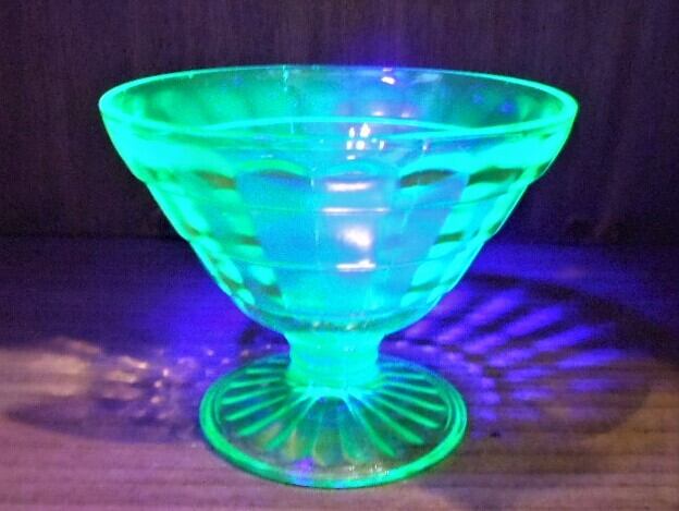 他のウランガラス同様に、ブラックライト下で、とても綺麗に光ります。
