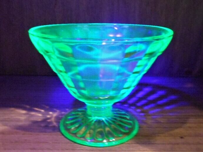 他のウランガラス同様に、ブラックライト下で、とても綺麗に光ります。