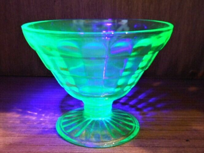 他のウランガラス同様に、ブラックライト下で、とても綺麗に光ります。