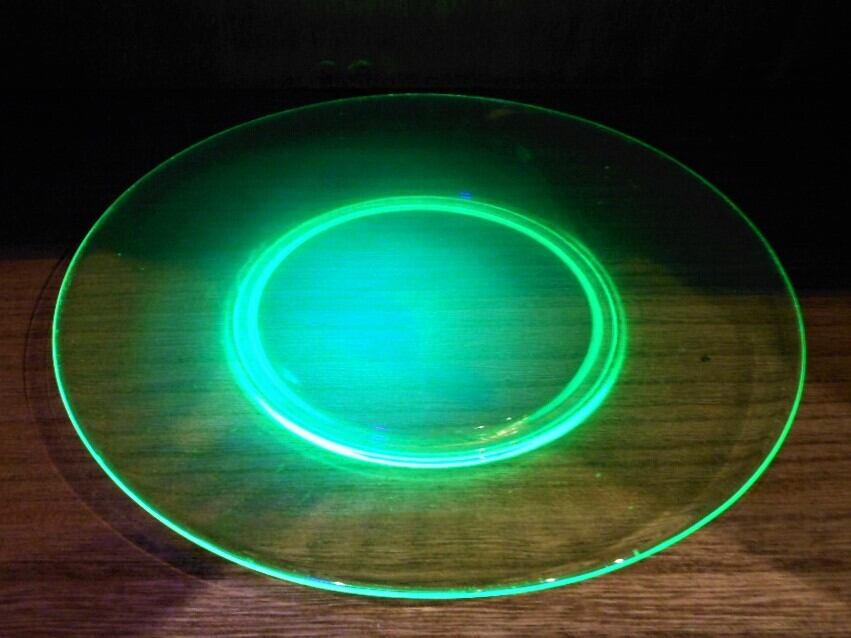 黄色の透明ガラスの綺麗なプレートに光が透けると、写真の様に縞模様の影が映ります。高級ガラス食器メーカーのフォストリア社ならではの透け感のあるエレガントな製品だと思います。90年の歳月を経ている為、多少の使用傷は有りますが、まだまだ現役でこのエレガントさが体験出来るレベルだと思います。ブラックライトを当てた時に黄色に近い黄緑色でびっくりするほど綺麗に発光します。年代が古い事もあり、ウランの含有量が違うのかもしれません。