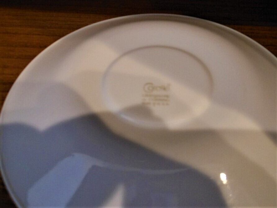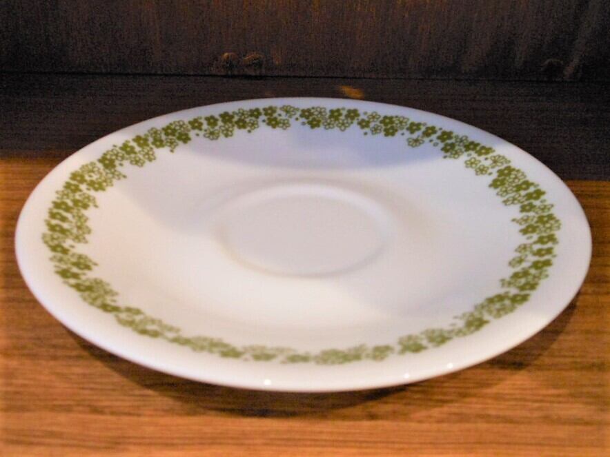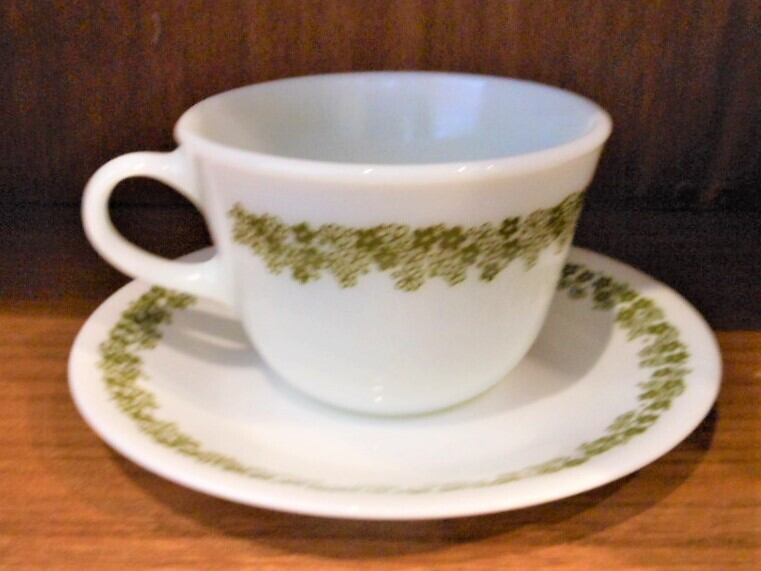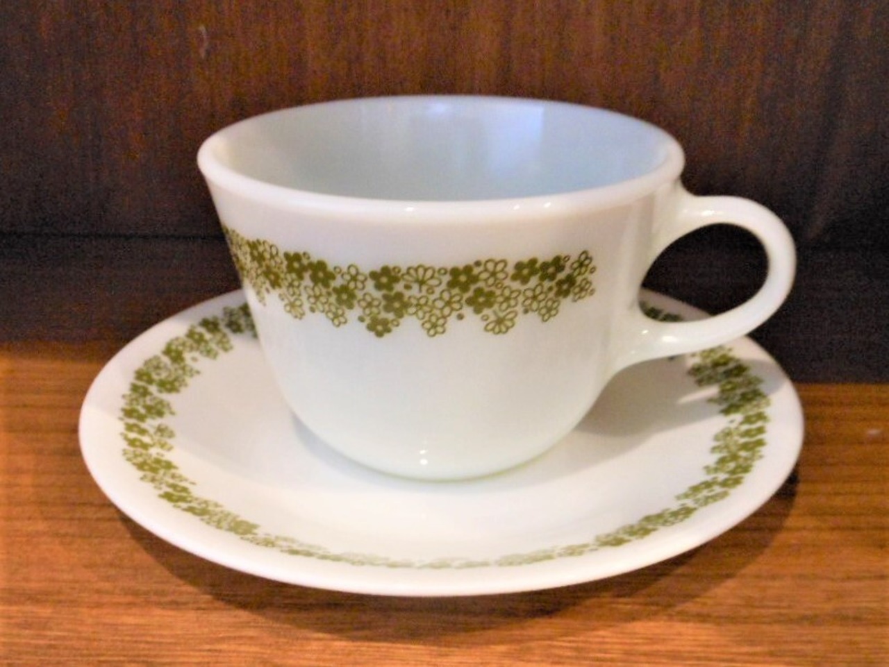 カップはパイレックスで、ソーサーはコレール製です。模様は長く愛された緑の小花模様です。模様が同じですのであまり違和感は有りませんが、素材は異なりますのでご理解の上ご購入頂けます様よろしくお願い致します。