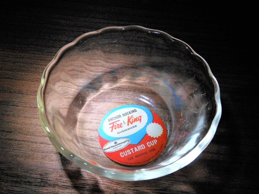 未使用、販売ラベル付きのアンカーホッキング社によって生産された、カスタードカップです。ラベルを剝がさないため、一度も洗浄していませんので、汚れは目立ちます。内容ご理解の上ご購入頂けます様よろしくお願い致します。