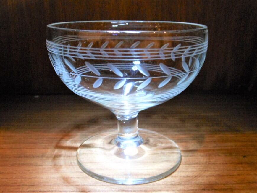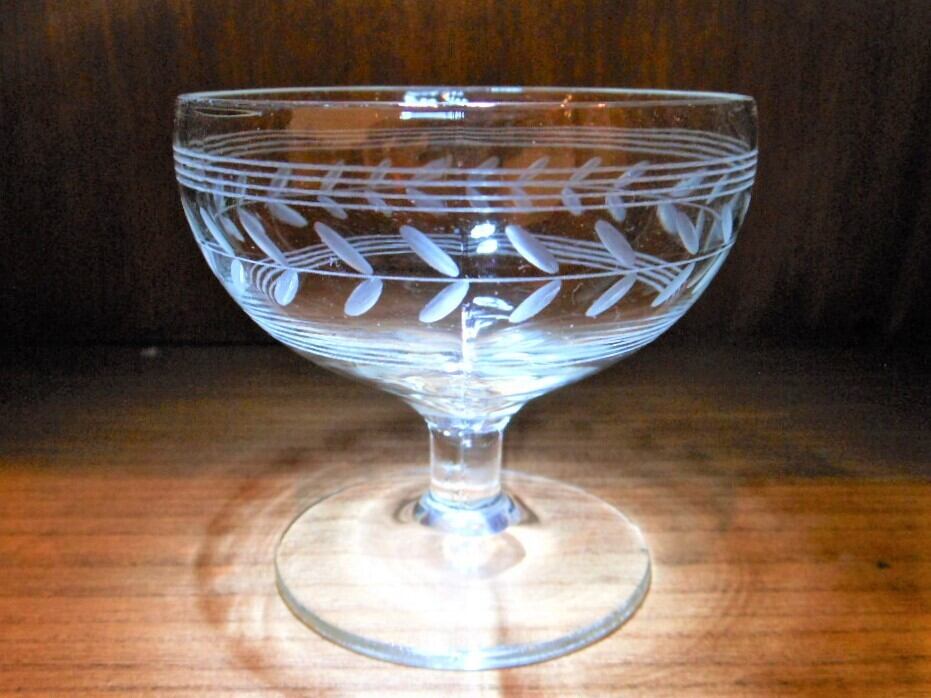 型押しガラスにエッチング技法で、ローレルの模様が入っています。綺麗な製品だと思います。高さ 約8.5㎝ / 幅 約8.5㎝ の商品です。